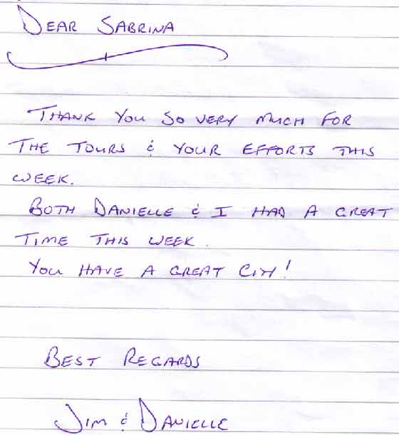 I got back home from your beautiful country on Saturday very tired and very happy. This is the first opportunity I have had to sit in front of the computer and write to you. I hope you understand. Tansy the trip you arranged for us was fantastic and everything went exactly according to plan.