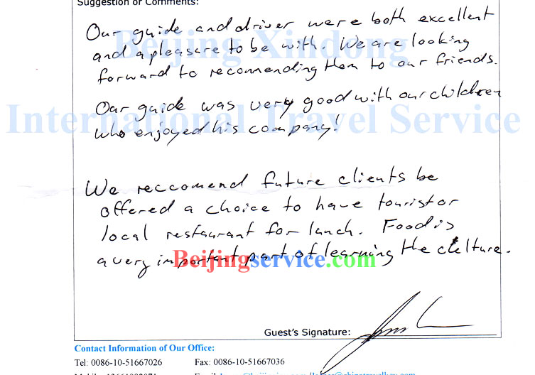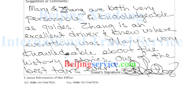 We would like to take this opportunity to say a big thank you to the Beijing Service team who were involved in both arranging and the guiding of our holiday in China. We undertook a 7 day trip in Beijing and Xi'an City, commencing on 6th September. This was our first visit to your country and we were not sure what to expect.