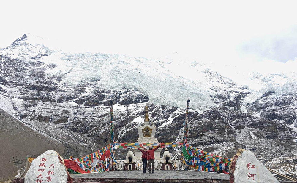 - Then drive for approximately 1 hour to visit one of Tibet's most beautiful glaciers, Karola Glacier. The enormous glacier tongue extends to the roadside, resembling a frozen waterfall hanging over the road and above your head.